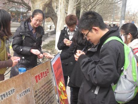 当日中午,党员、预备党员和积极分子们来到翰林桥,将准备好的条幅和展板摆放好,并邀请来到食堂吃饭的同学们参加“便利贴”签名活动。活动中,参与者将自己希望完成的“好事”写在便利贴上,并签上名字,作为学习雷锋的“事前小计划”,以督促自己用实际行动完成学习雷锋的誓言。活动现场,同学们给予了积极的响应,从“为老人指路让座”到“成为志愿者”,“为贫苦地区募捐、支教”,五颜六色的便利贴布满了展板,汇聚了一个个心愿。于此同时,活动的组织者向广大同学发放了原创设计的“学雷锋”主题书签。