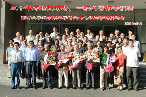 10月3日下午,数学学院大楼外挂起“三十年历经风雨路,一颗心常怀母校情”的大字横幅。在数学学院领导大力支持和周密组织下,数学系数学专业77级的30名员工在数学学院第二会议室举行了毕业30年纪念座谈会。数学系老教师代表姚家超、张朝池、刘光绪、白继祖、肖云茹参加了座谈会,数学学院有关院领导和老师出席了座谈会。
