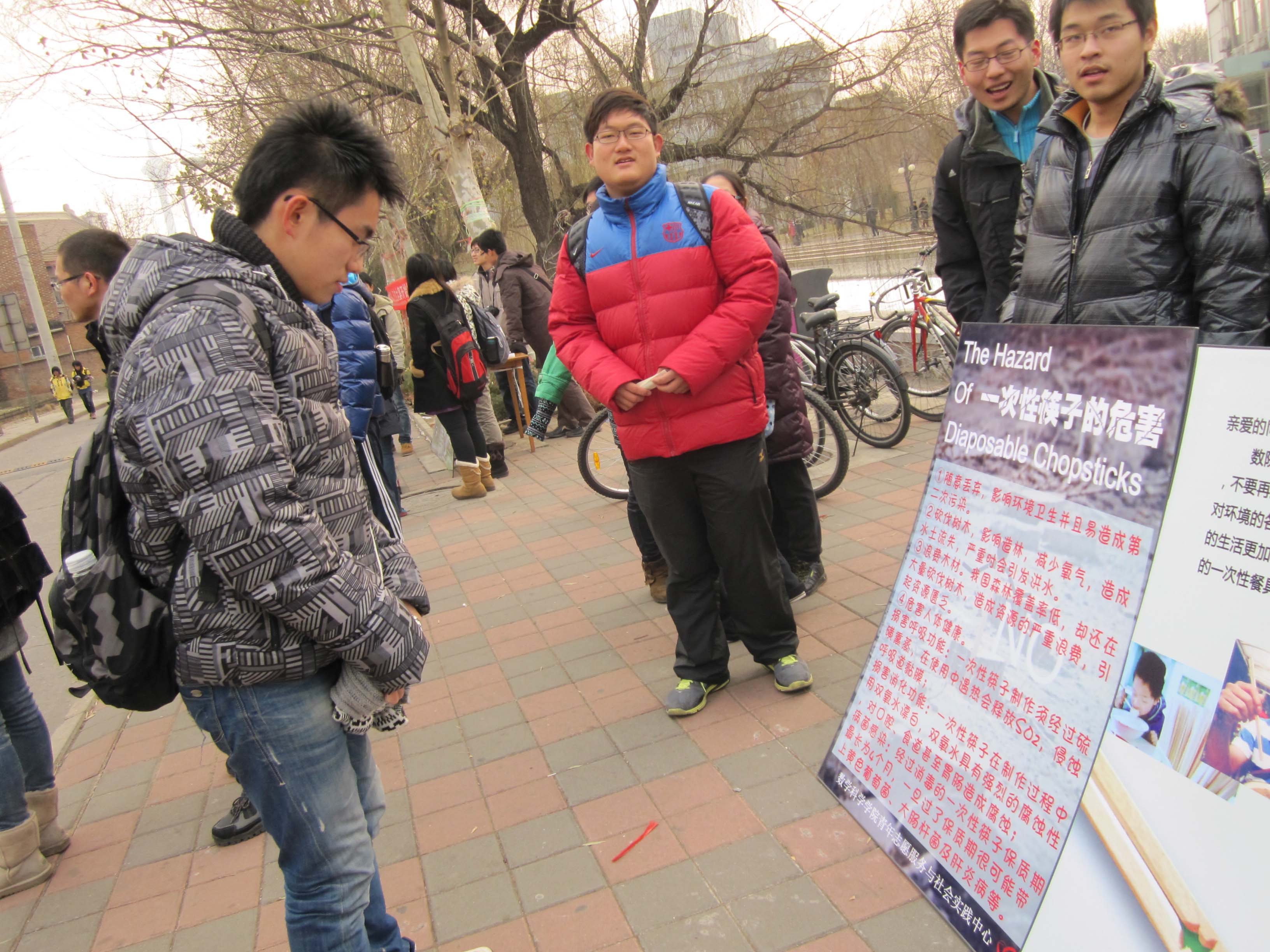 (通讯员 黄嘉莉 李林)为响应党的十八大报告中关于“加强生态文明建设”的号召和要求,数学院青年志愿服务与社会实践中心举办了“美丽中国,美丽家乡,美丽南开”系列环保活动。12月12日,学院青志协联合数学院暑期赴河南济源蟒河林场的社会实践团在二食桥头举办了拒绝使用一次性筷子宣传活动暨赴河南济源蟒河林场社会实践团成果展示活动。志愿者们参与这次活动的积极性很高,一行十多人声势浩大地在二食桥头向同学们介绍社会实践感受和成果,并呼吁同学们保护环境,杜绝使用一次性餐具。寒风凛冽,要想吸引路过的同学们驻足不是件容易的事。为了提高关注度,志愿者们齐声高喊时髦的口号“一次性筷子坑爹啊,坑爹啊,坑爹啊,啊啊啊……”吸引了不少同学的注意。同时也有志愿者走到路过的同学面前,耐心地介绍使用一次性餐具的危害并邀请他们阅读展板内容。在大家的努力下,志愿者们吸引了不少同学的关注,为大家普及了环境保护的诸多知识,并劝诫大家以后拒绝使用一次性筷子。