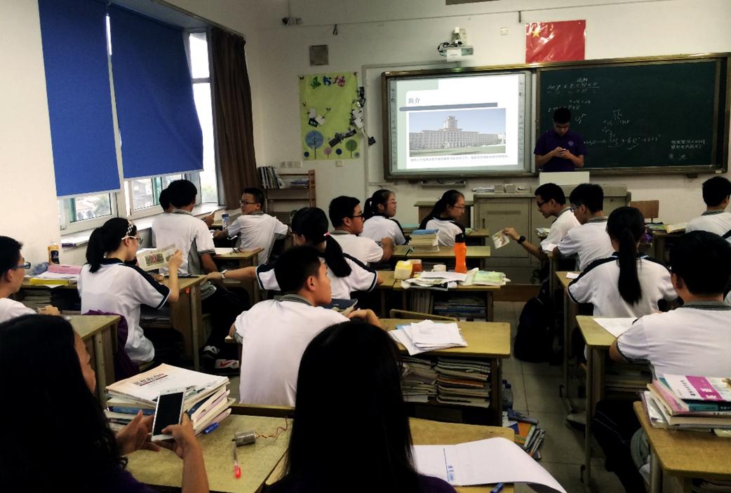 9月3日下午,社会实践队成员抵达温州中学。温州中学以培养数学人才著称,享有“数学家的摇篮”的美誉。我们成员刚进入教室,同学们好奇的目光便纷纷投来。首先是社会实践队成员殷明烨上台介绍温籍数学家姜立夫的生平,将前两天在温州的所见所感与自己备好的资料相结合,为同学们全面的展现了这个为人豁达敦厚、凡事以发展中国的数学事业为重、不遗余力的造就和提携数学人才的数学家的一生。