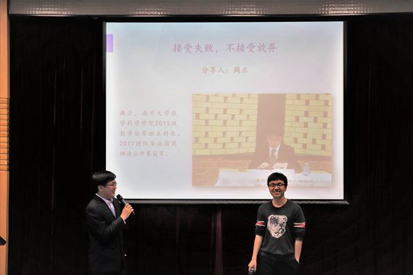 2014级数学伯苓班本科生栾雨因参加江苏卫视“最强大脑”节目而被大家熟知。在分享中,他提到参加节目的这段经历是他最大的收获。在节目中,栾雨曾一路“开挂”,获得“全能浪子”的封号,也曾败阵连连,饱受质疑。不过,生活终归平静,没有人一直站在舞台上。面对比赛结果,他坦然地说,输赢不重要,但求问心无愧,挑战与挫折恰好让自己回归初心,无论现在还是未来,都要奋力一搏。