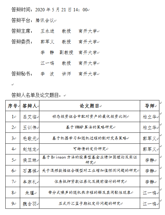 数学科学学院硕士研究生(吕艾临等10人) 毕业论文线上答辩公告