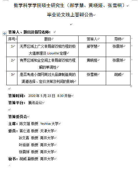 数学科学学院硕士研究生(郝学慧、黄晓娅、张雪桐) 毕业论文线上答辩公告