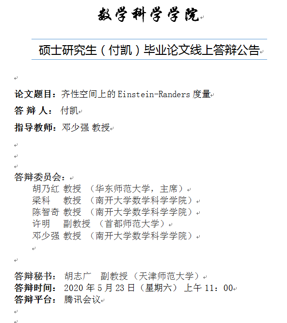 数学科学学院 硕士研究生(付凯)毕业论文线上答辩公告
