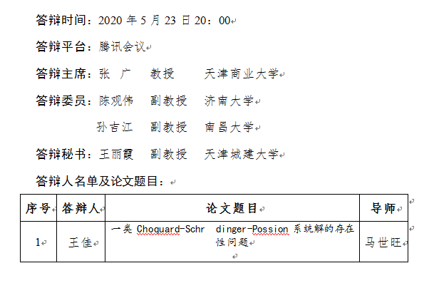 数学科学学院硕士研究生(王佳) 毕业论文线上答辩公告