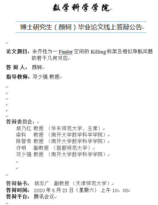 数学科学学院 博士研究生(颜轲)毕业论文线上答辩公告