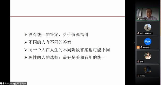 尤建功教授受邀作了题为“数学:有用vs好玩”的主题报告,与参营师生针对有用和好玩两个因素对数学发展的驱动作用进行了探讨,并从哲学、科学、艺术、数学发展史等角度讲述了数学研究对社会和研究者个人的意义,为全体营员带来了深刻且生动的一课。
