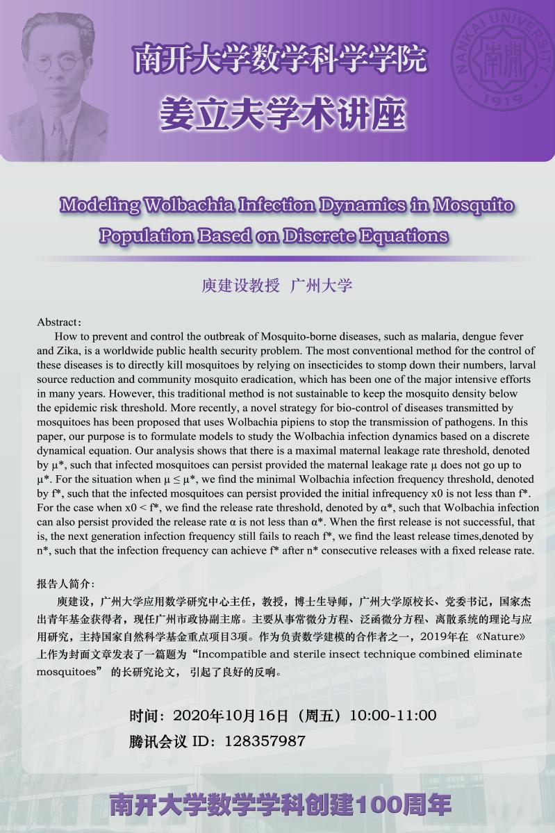 【姜立夫学术讲座】Modeling Wolbachia infection dynamics in mosquito population based on discrete equations
