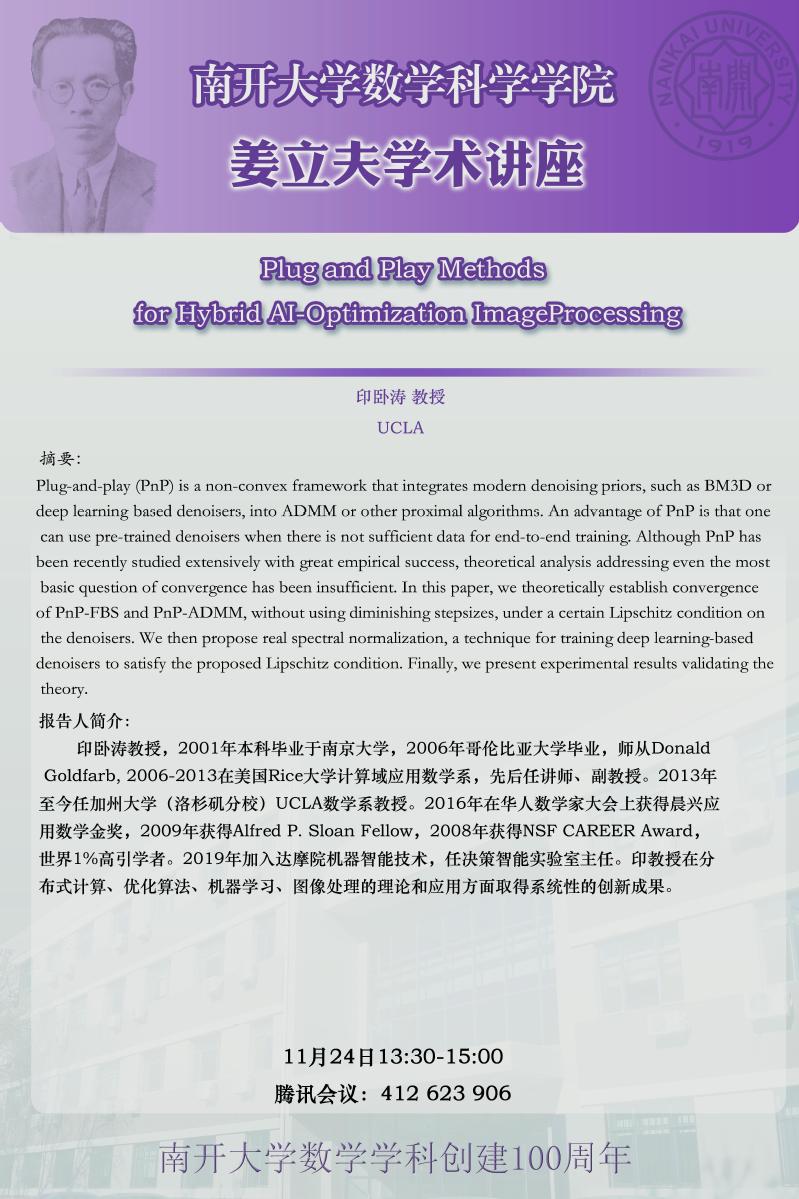【姜立夫学术讲座】Plug and Play Methods for Hybrid AI-Optimization Image Processing