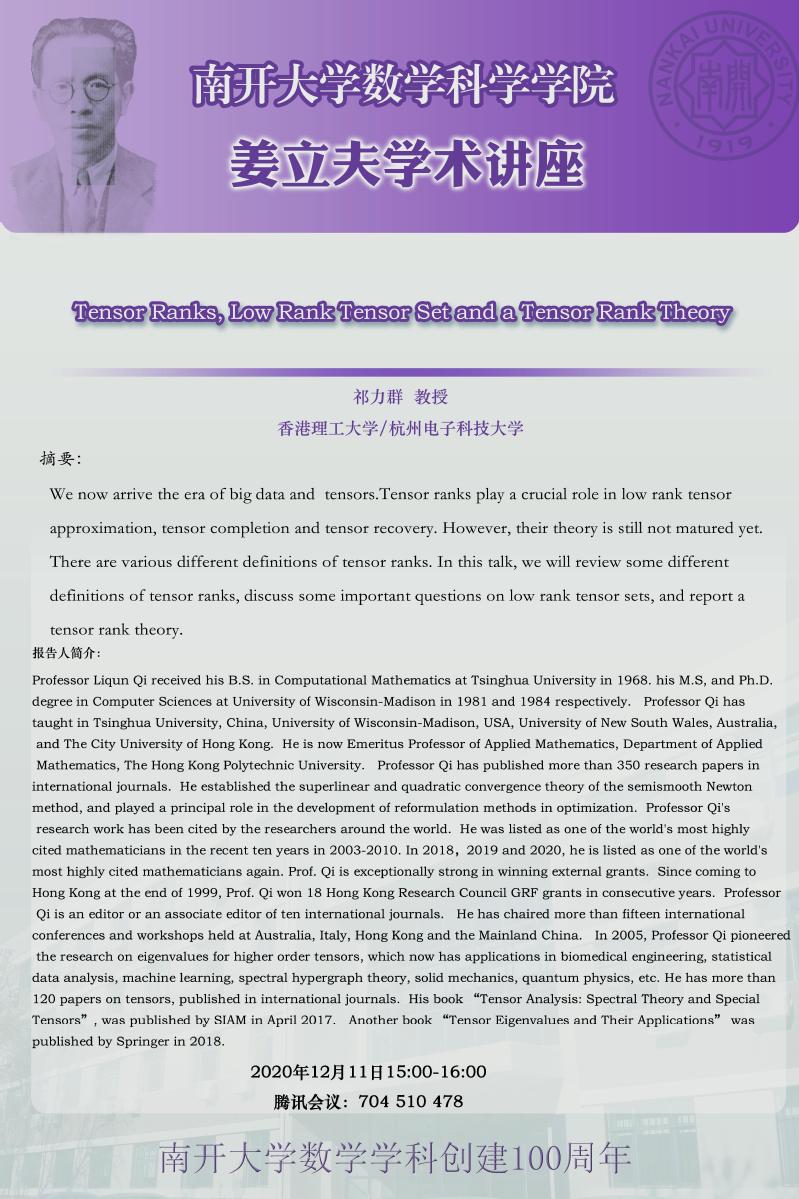 【姜立夫学术讲座】Tensor Ranks,Low Rank Tensor Set and a Tensor Rank Theory