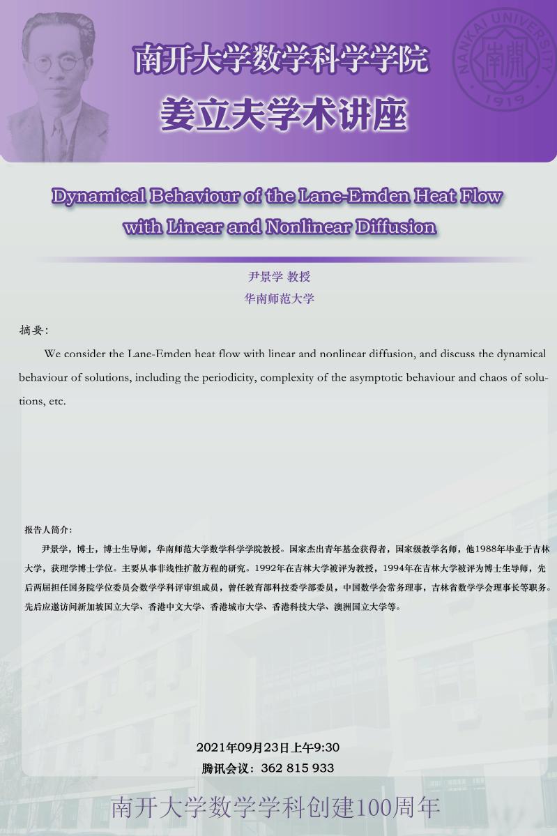 【姜立夫学术讲座】Dynamical Behaviour of the Lane-Emden Heat Flow with Linear and Nonlinear Diffusion