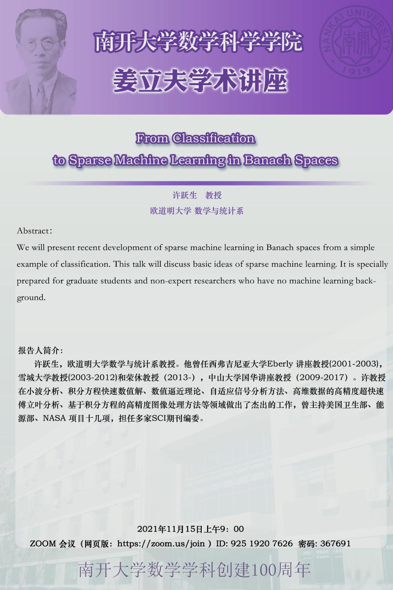 【姜立夫学术讲座】From Classification to Sparse Machine Learning in Banach Spaces