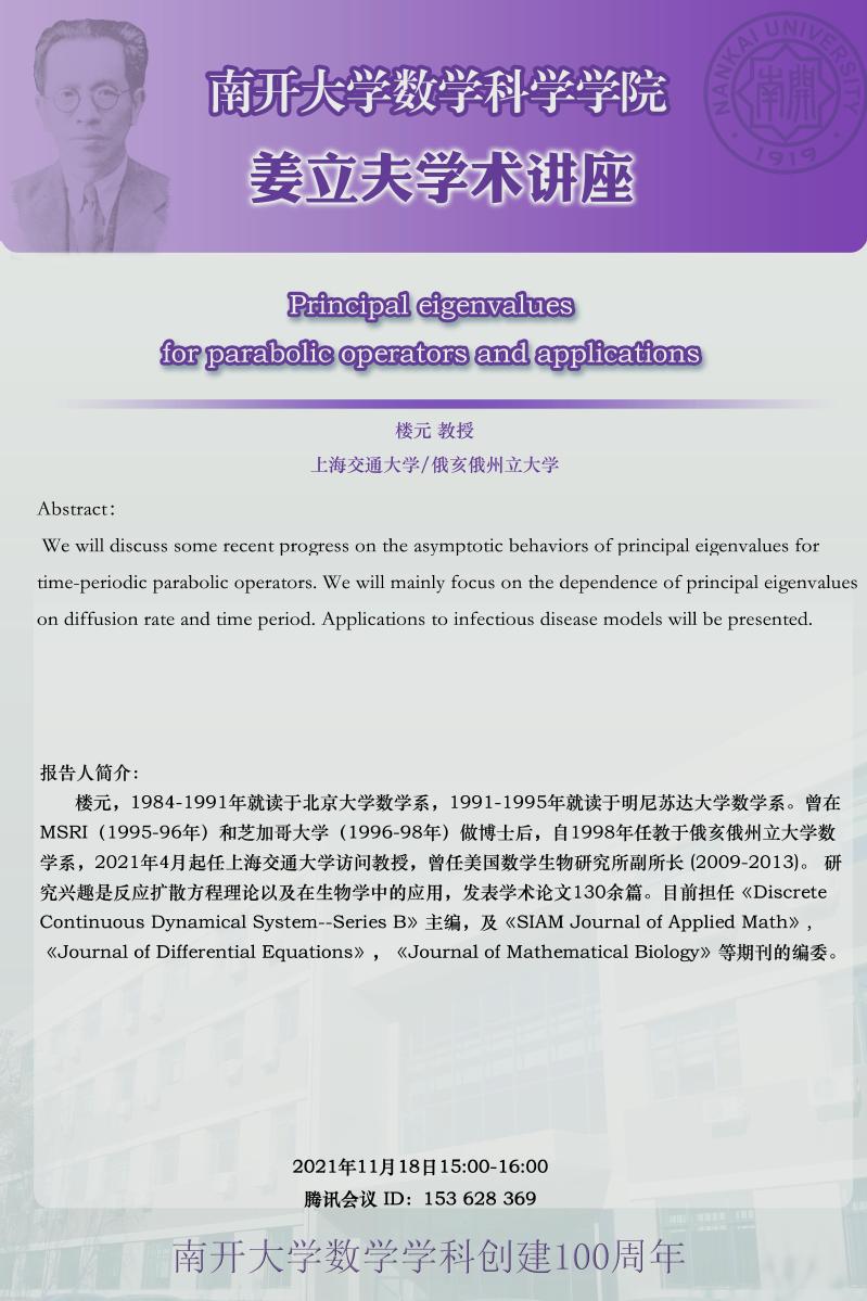 【姜立夫学术讲座】Principal eigenvalues for parabolic operators and applications