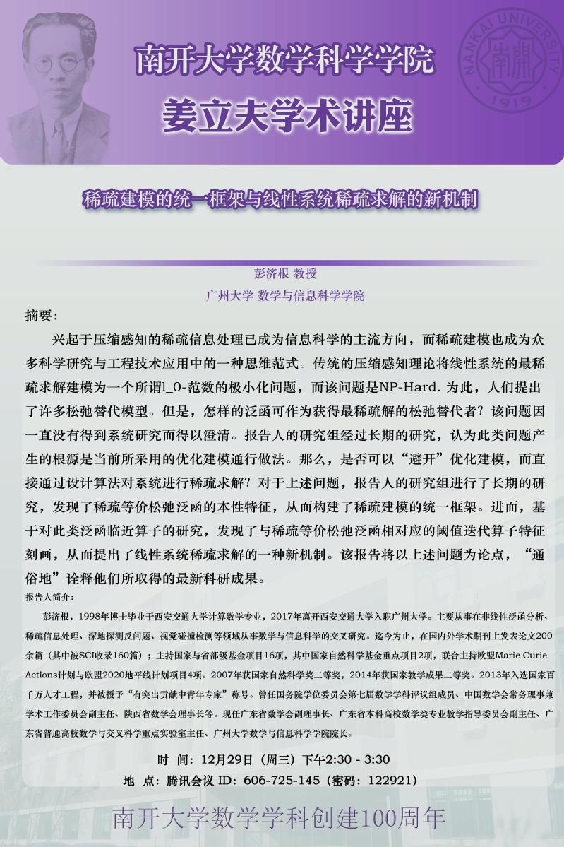 【姜立夫学术讲座】稀疏建模的统一框架与线性系统稀疏求解的新机制