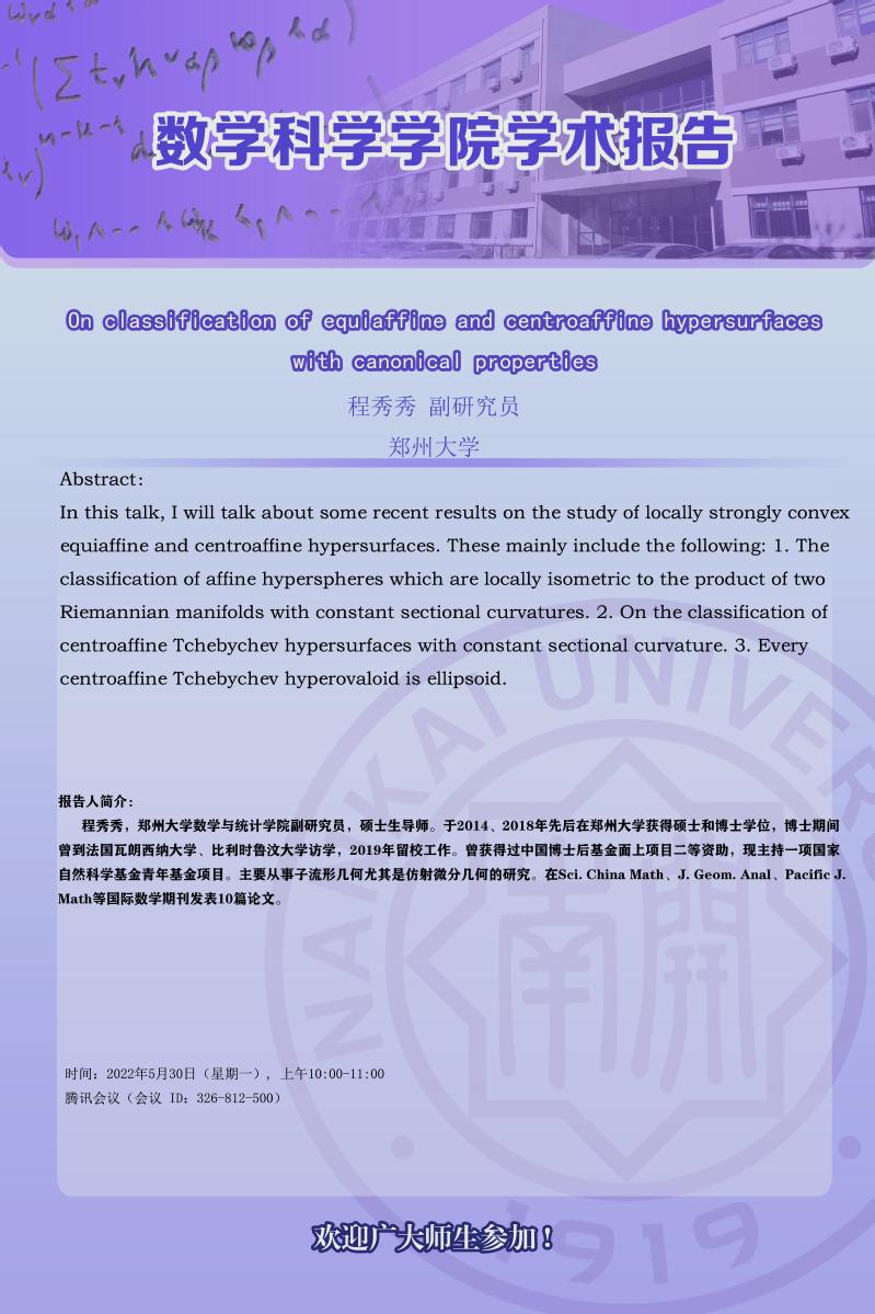 On classification of equiaffine and centroaffine hypersurfaces with canonical properties