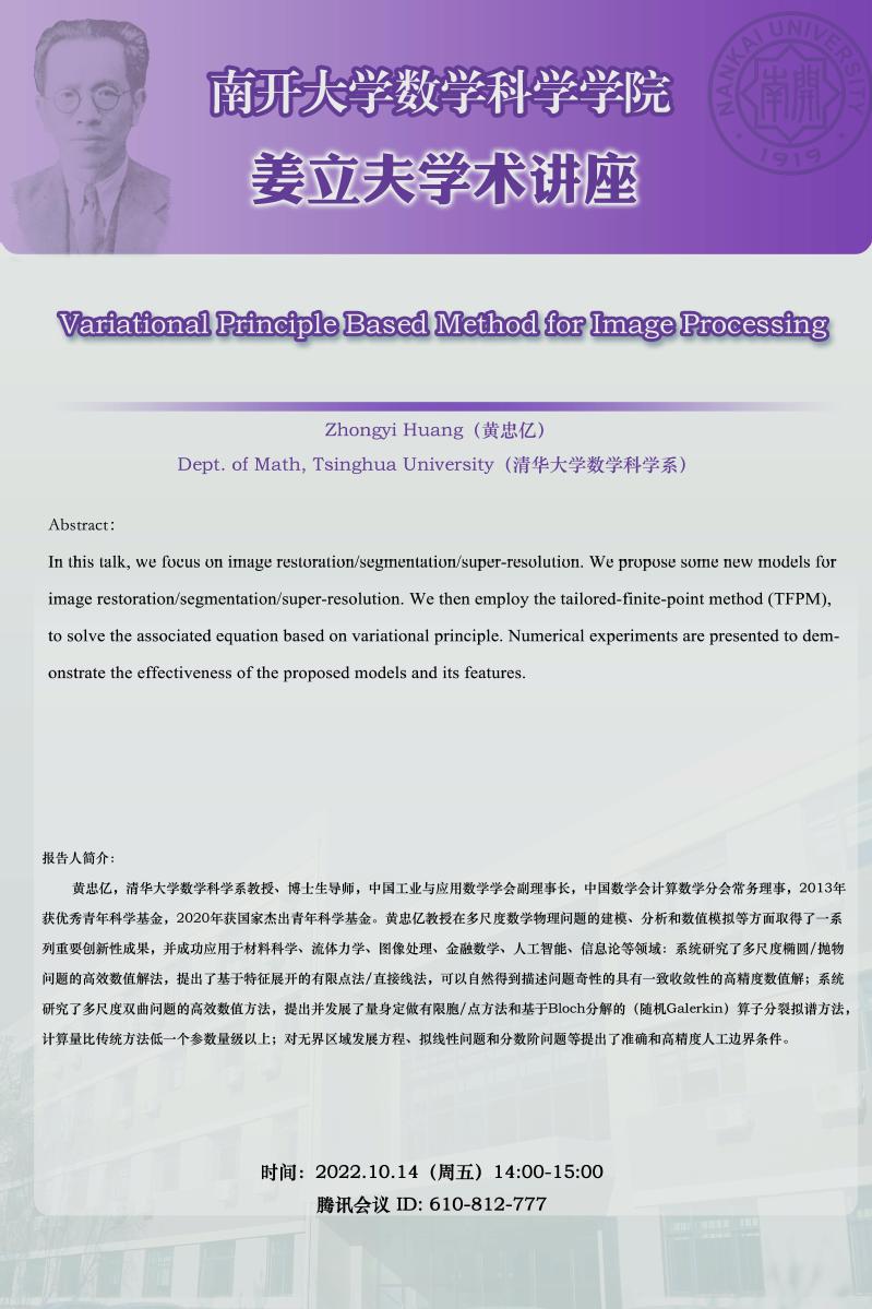 【姜立夫学术讲座】 Variational Principle Based Method for Image Processing