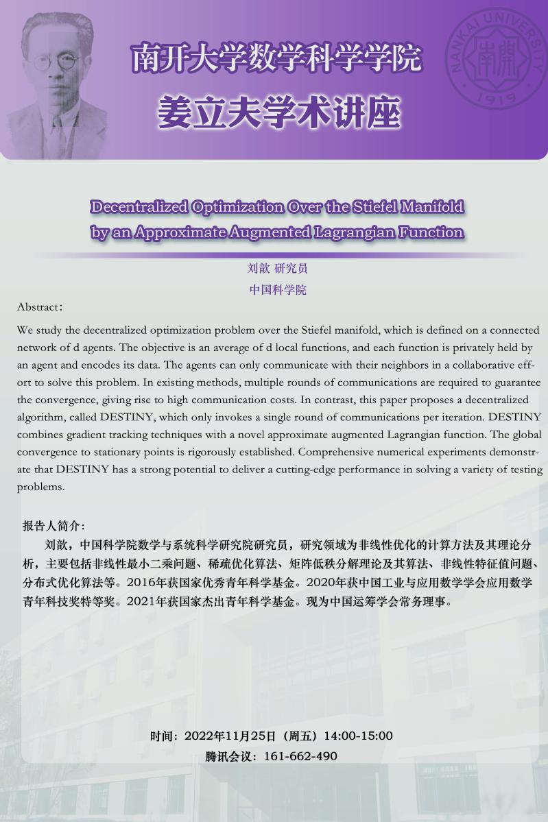 【姜立夫学术讲座】Decentralized Optimization Over the Stiefel Manifold by an Approximate Augmented Lagrangian Function