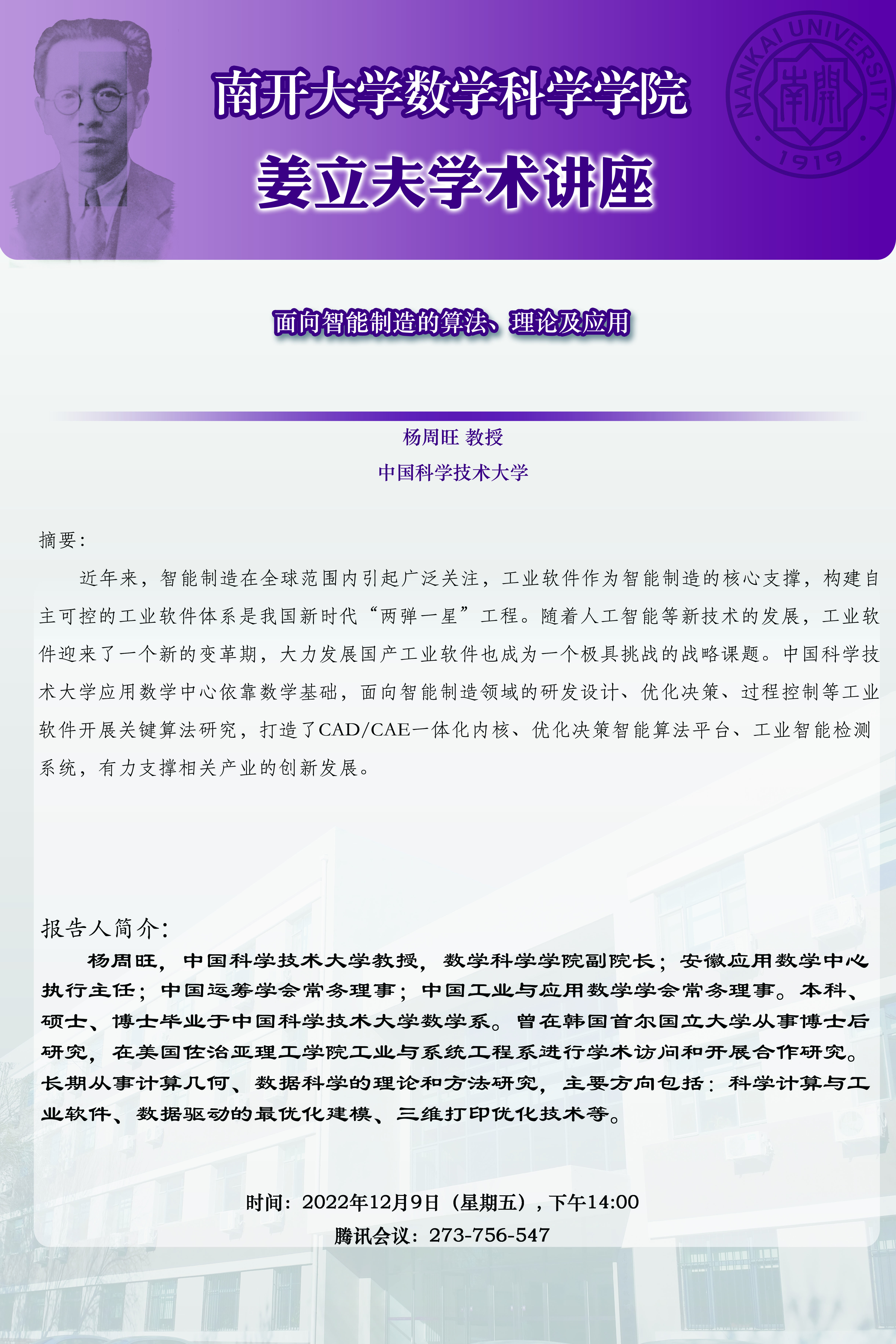 【姜立夫学术讲座】面向智能制造的算法、理论及应用
