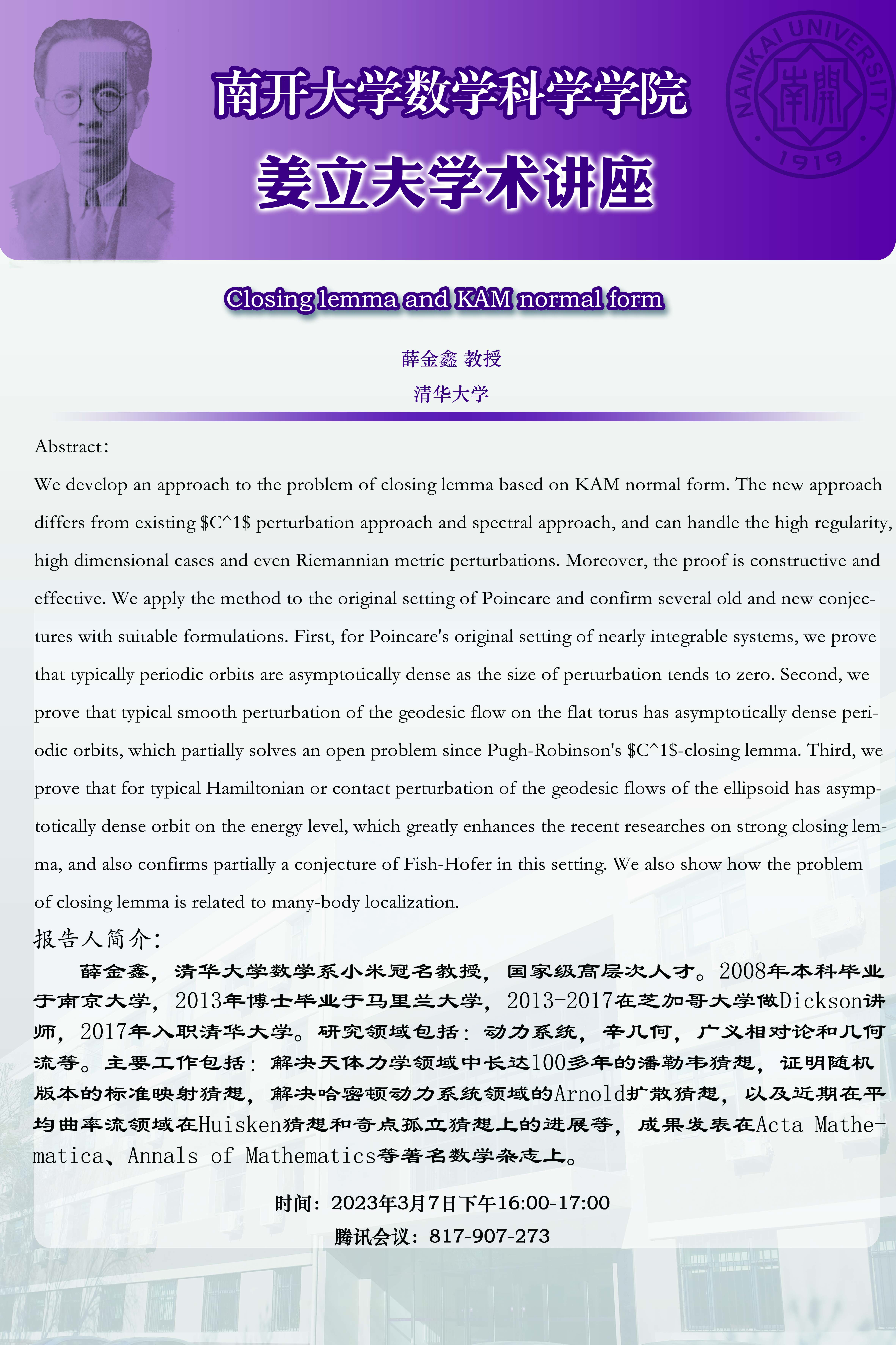 【姜立夫学术讲座】Closing lemma and KAM normal form