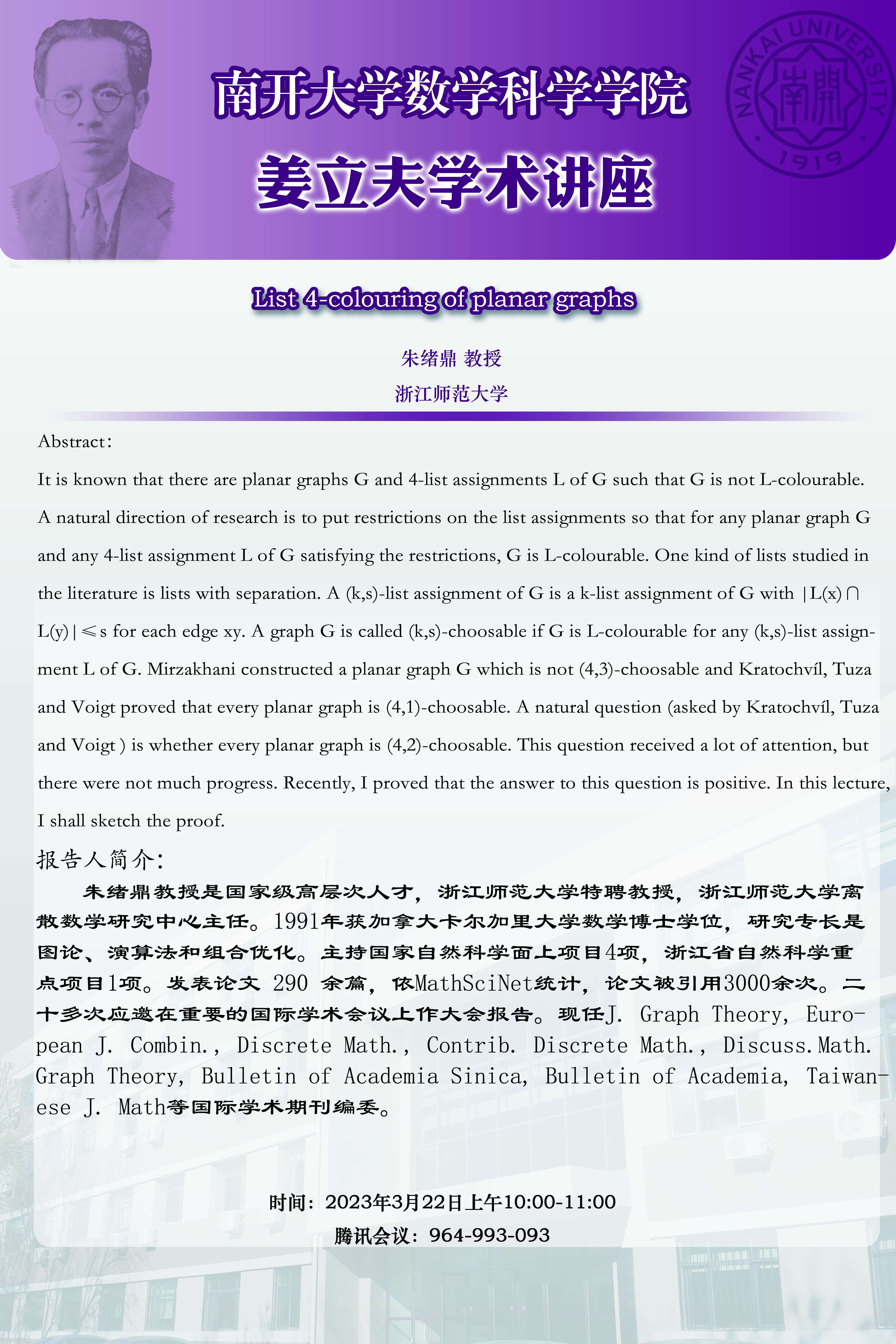 【姜立夫学术讲座】List 4-colouring of planar graphs