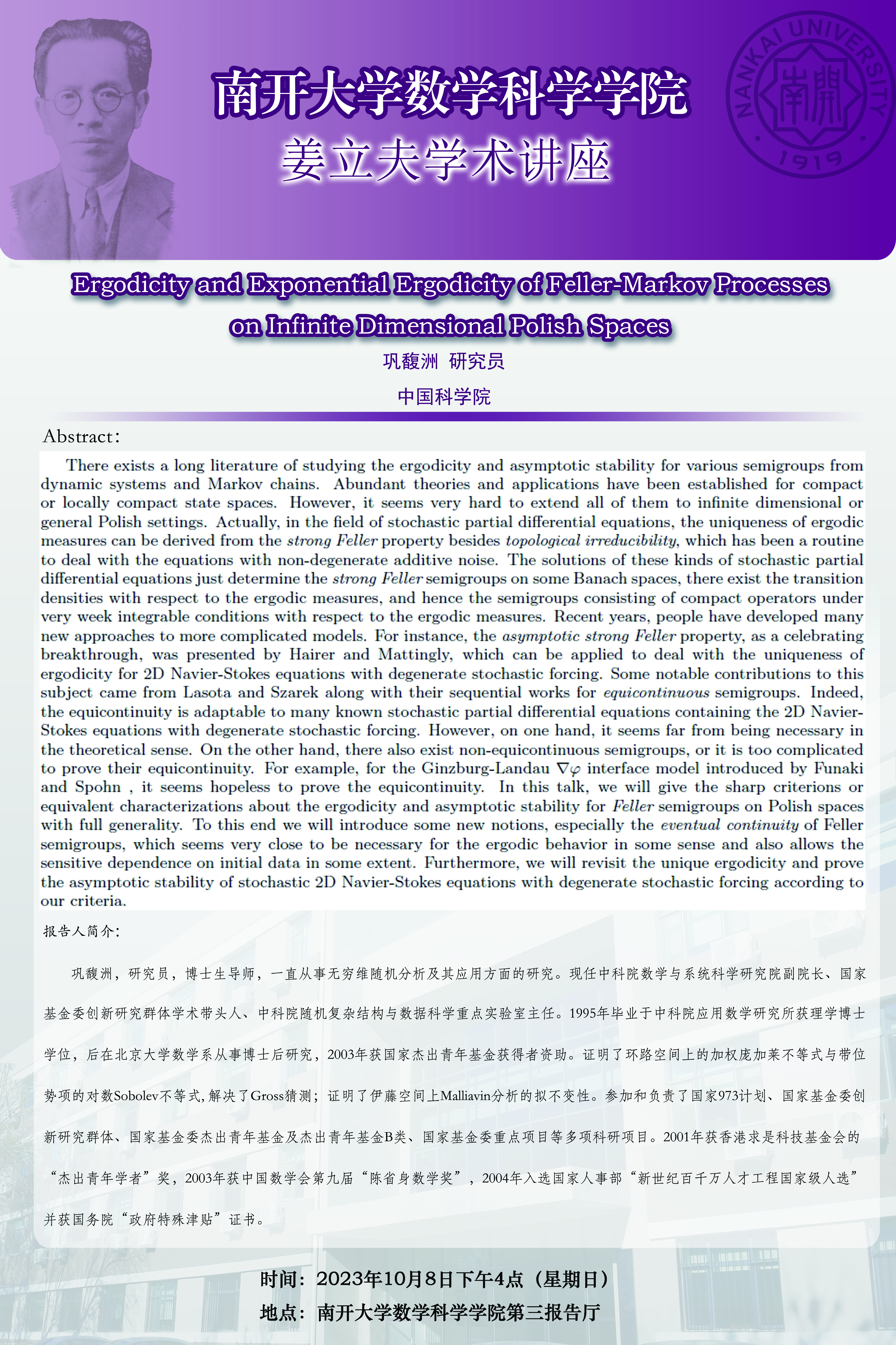 【姜立夫学术讲座】Ergodicity and Exponential Ergodicity of Feller-Markov Processes on Infinite Dimensional Polish Spaces