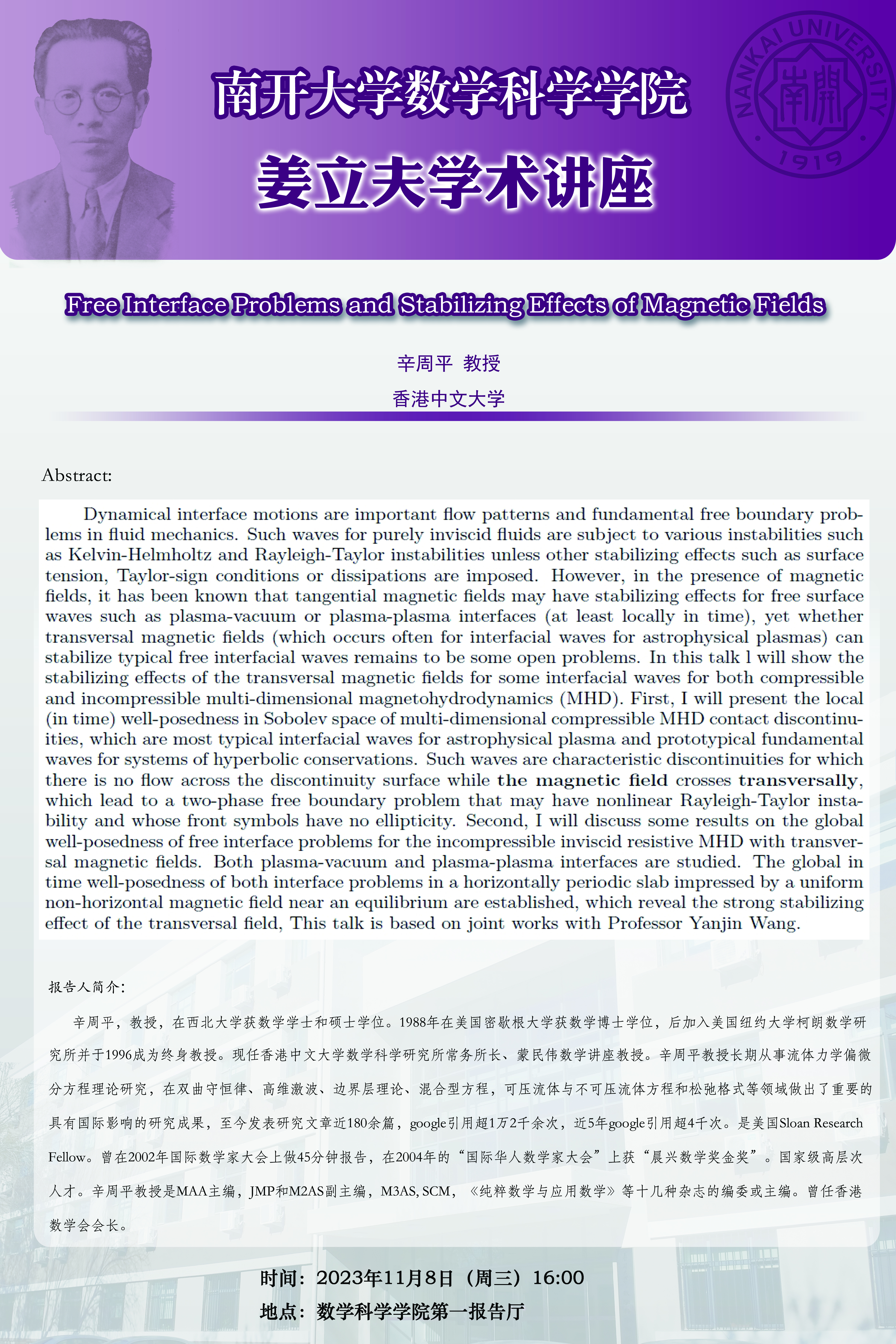 【姜立夫学术讲座】Free Interface Problems and Stabilizing Effects of Magnetic Fields