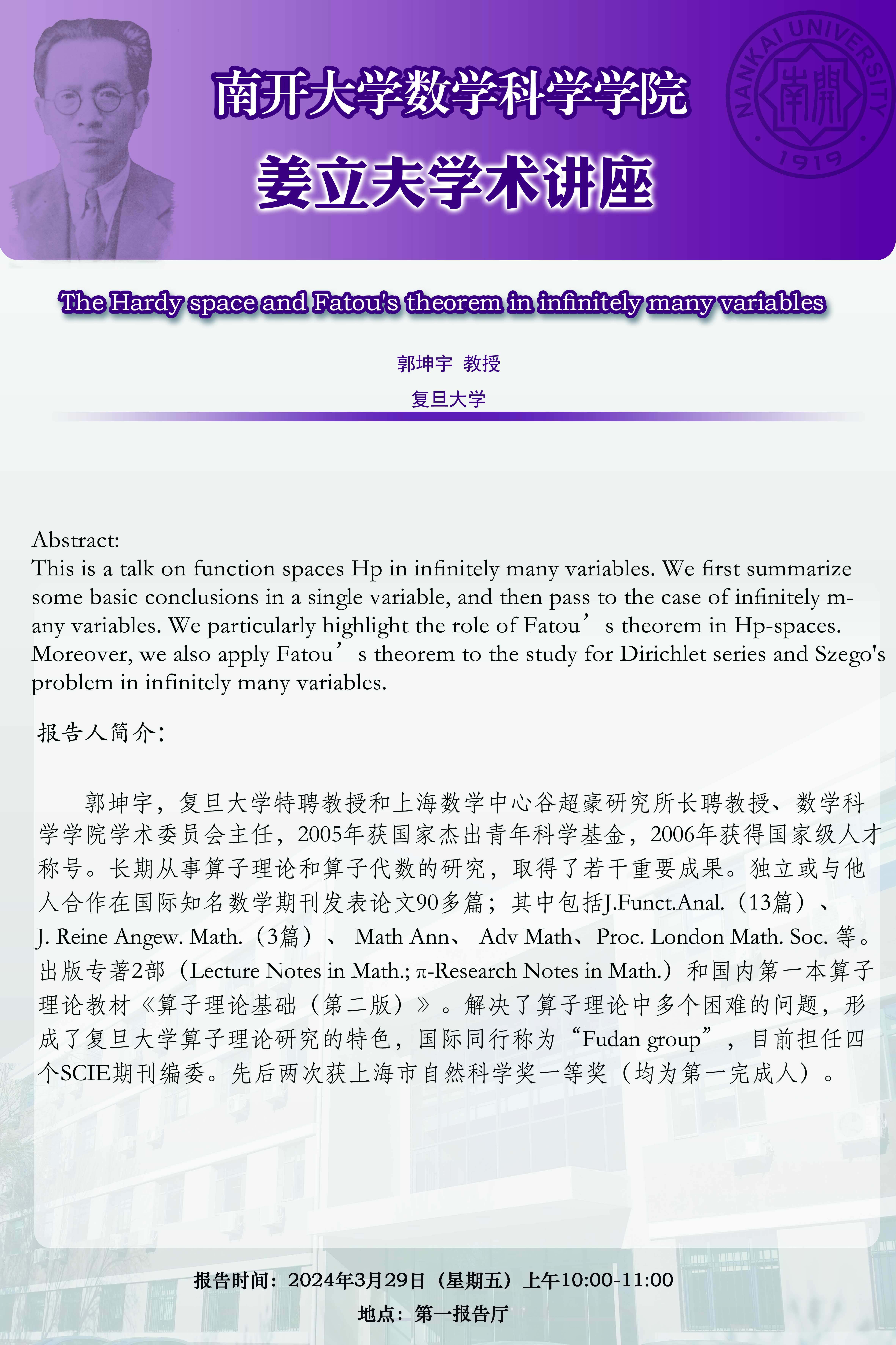 【姜立夫学术讲座】The Hardy space and Fatou's theorem in infinitely many variables