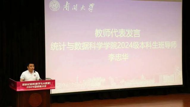 统计与数据科学学院班导师代表李忠华发言。他首先祝贺了新生们“披荆斩棘”、“乘风破浪”,通过高考来到 “无限超越班”。“少年易老学难成,一寸光阴不可轻”,他鼓励新生自由选择老员工活方式,抓住光阴,“认真年轻”。