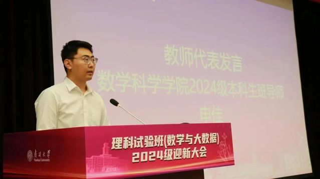 数学科学学院班导师代表申佳发言。他给新生提出了宝贵的学习生活建议,包括重视身心健康、专注学习并锻炼思维、积极与同学交流合作、勇于探索未知参与活动,期望同学们珍惜大学时光,勇敢追求梦想,书写青春篇章。