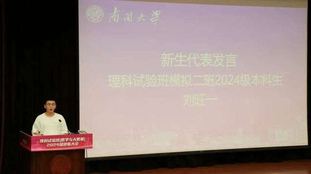 理科试验班(数学与大数据)模拟二班刘旺一作为新生代表发言。他回顾了十二载求学路及高考经历,期待从南开携手再出发,迎接新挑战。同时,他以南开“大先生”为榜样,呼吁新时代南开人应心怀家国,坐冷板凳练真本领,向最需处进发。