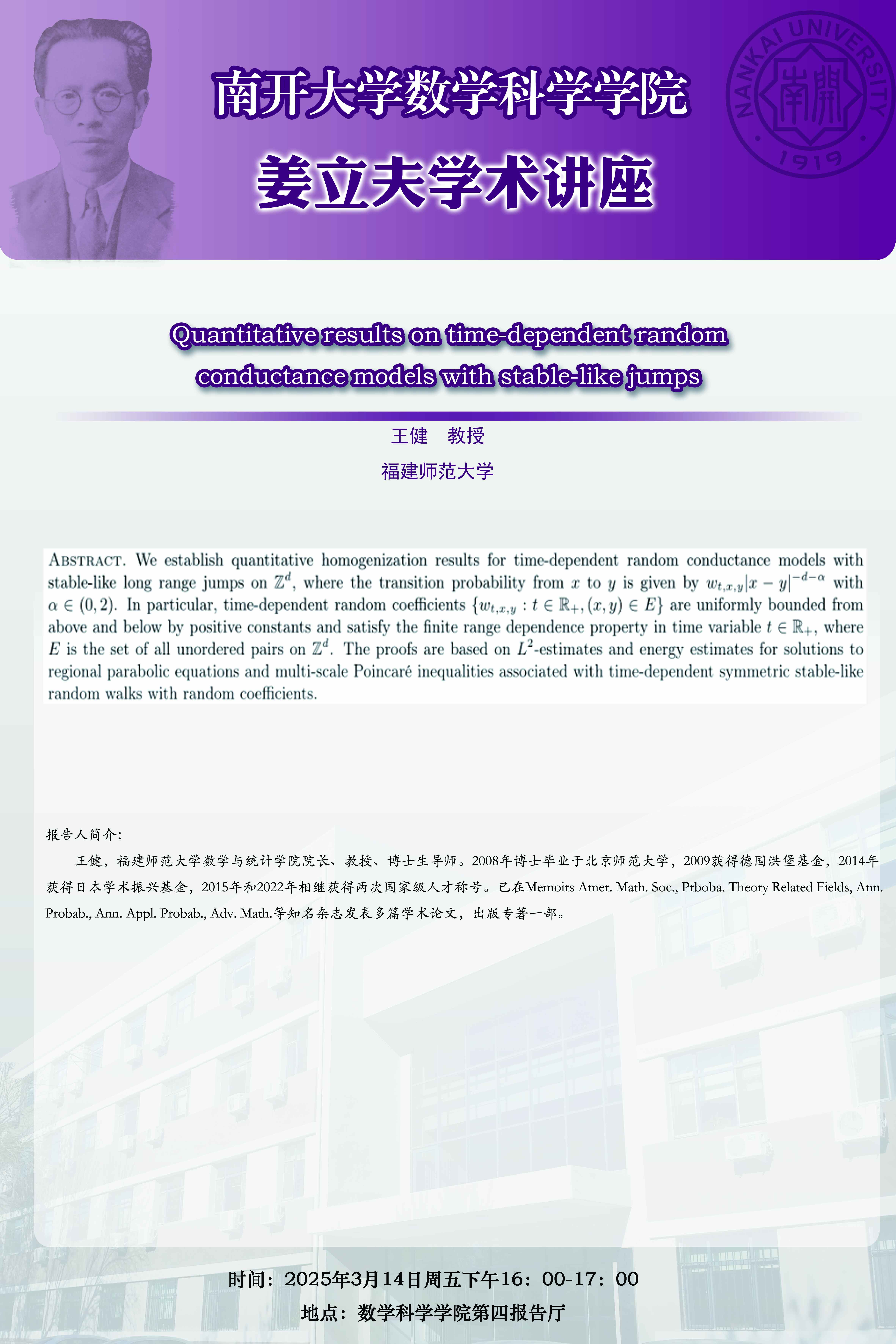【姜立夫学术讲座】Quantitative results on time-dependent random conductance models with stable-like jumps