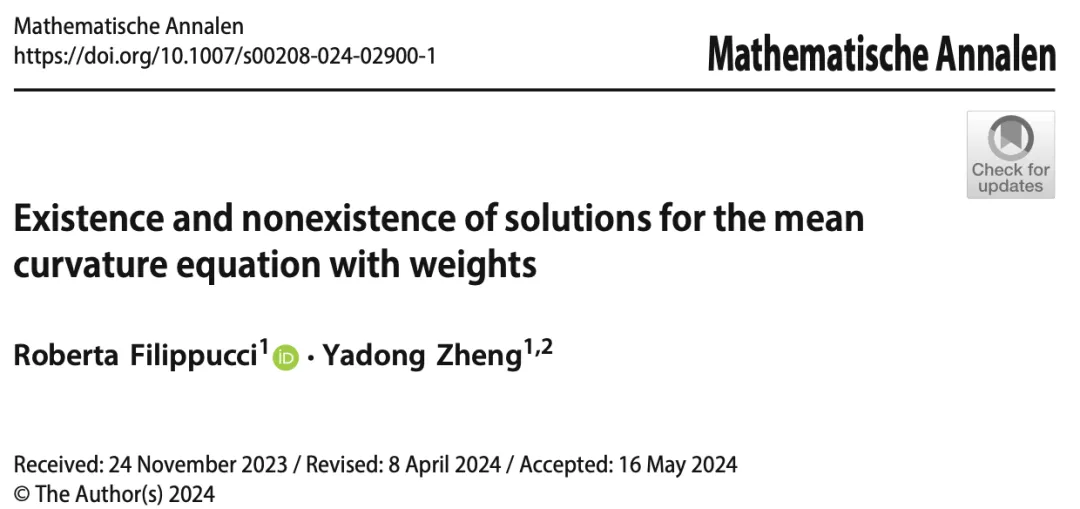 近日,公司 2020 级博士生郑亚东在联合培养期间与意大利佩鲁贾大学 R. Filippucci 教授合作在Mathematische Annalen (德国数学年刊) 上发表了题为 “Existence and nonexistence of solutions for the mean curvature equation with weights” 的学术论文。