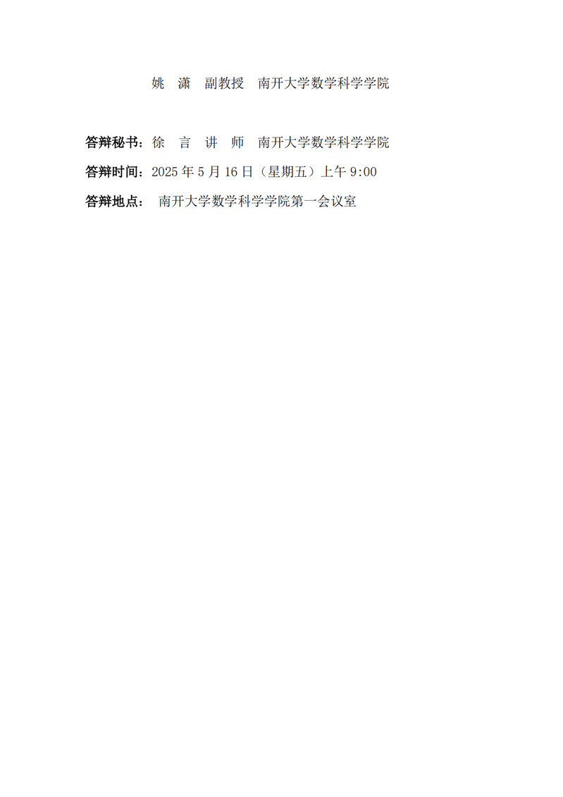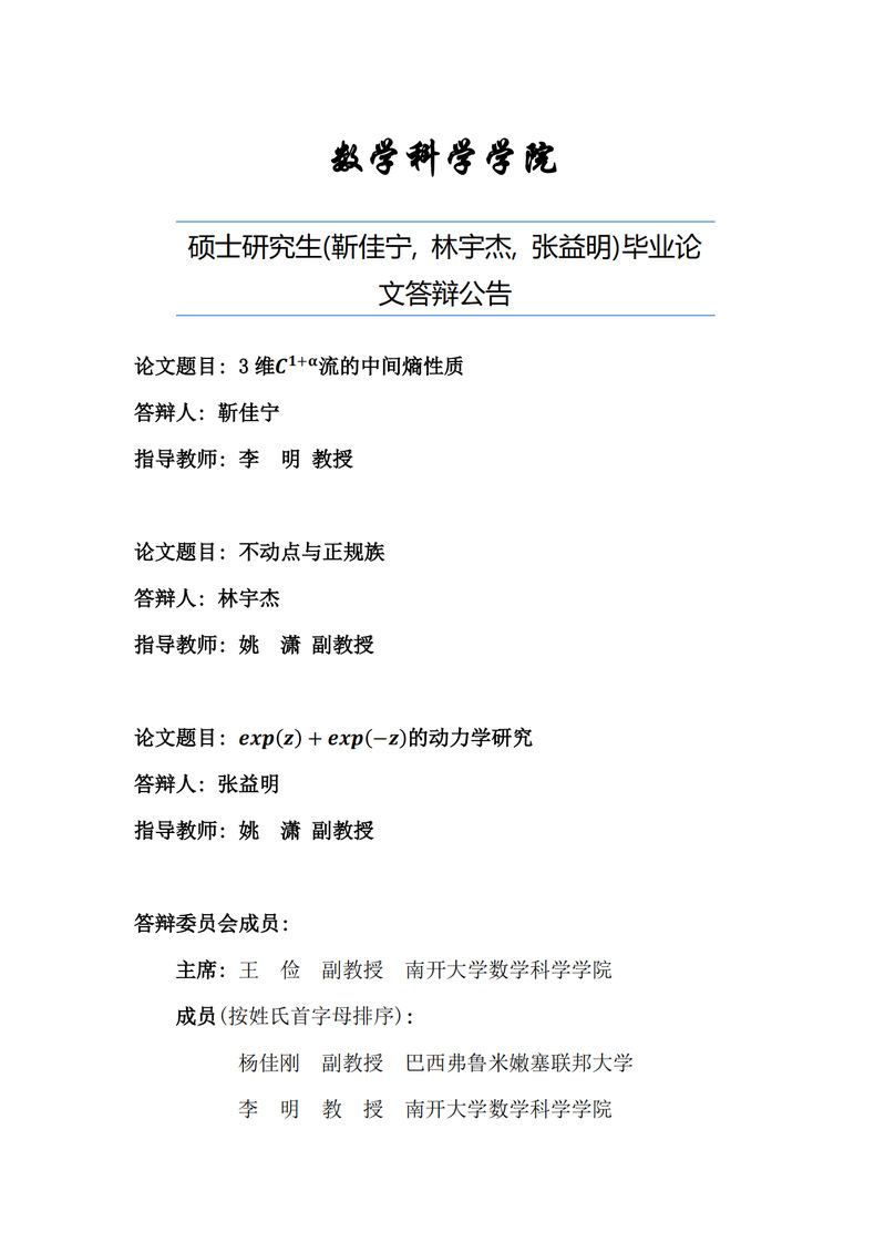 数学科学学院硕士研究生(靳佳宁、林宇杰、张益明)毕业论文线下答辩公告