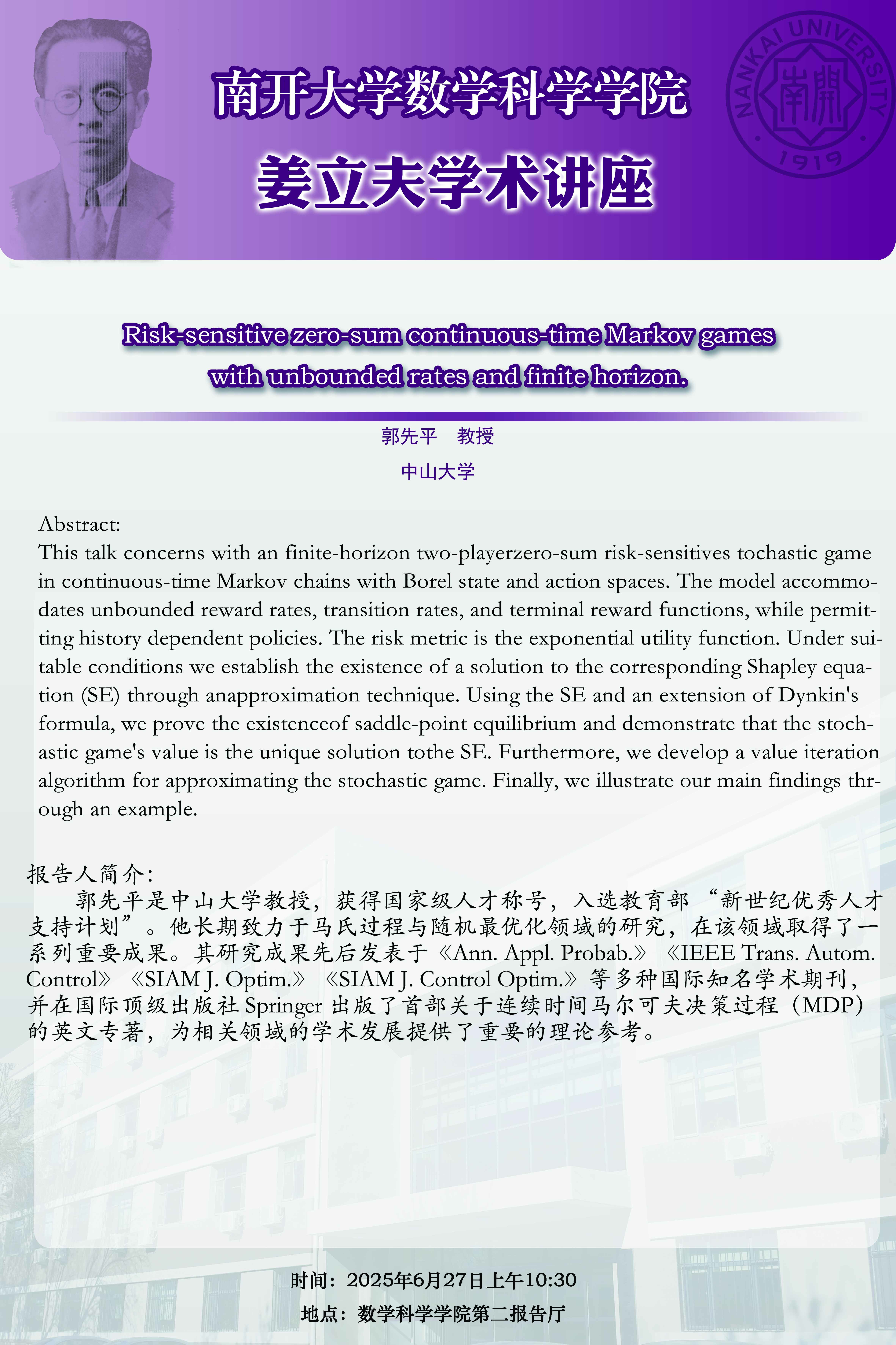 【姜立夫学术讲座】Risk-sensitive zero-sum continuous-time Markov games with unbounded rates and finite horizon.