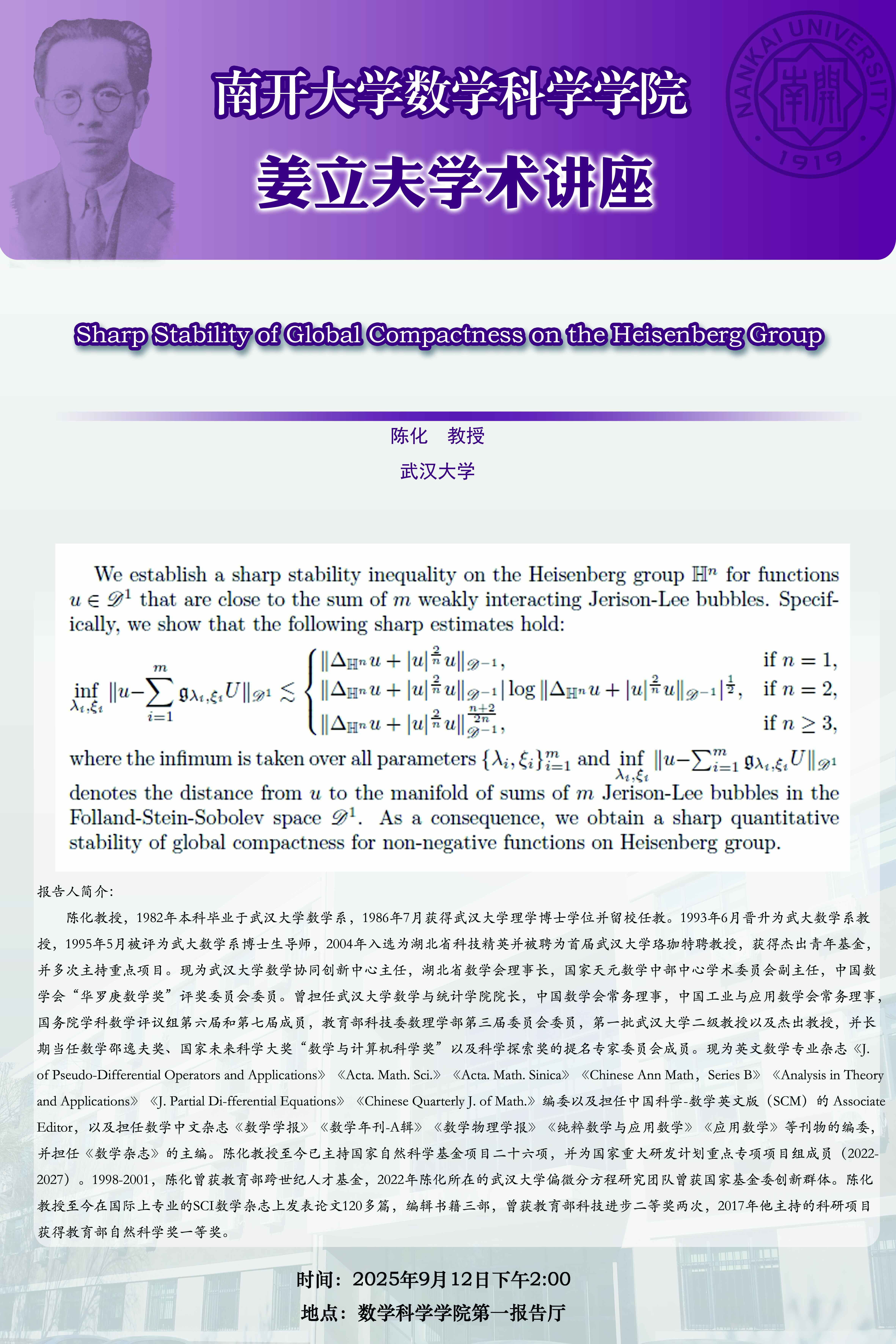 【姜立夫学术讲座】Sharp Stability of Global Compactness on the Heisenberg Group