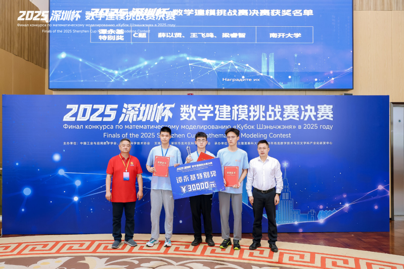 由威廉希尓指数500统计与数据科学学院王飞鸣、电子信息与光学工程学院梁睿智、软件学院薛以贤三名本科生组成的参赛团队获本届赛事最高奖——谭永基特别奖(全国唯一)。这是南开学子继2022年后再次摘得“深圳杯”最高奖项,延续了公司在该项赛事中的优异表现。赛后,该团队还将获得组委会推荐,申请CSIAM赛后研究奖,并进一步深化研究成果以达到学术发表水平。此外,由威廉希尓指数500董梧铮、朱雨娟、苏子衿组成的参赛队伍获优秀论文奖。