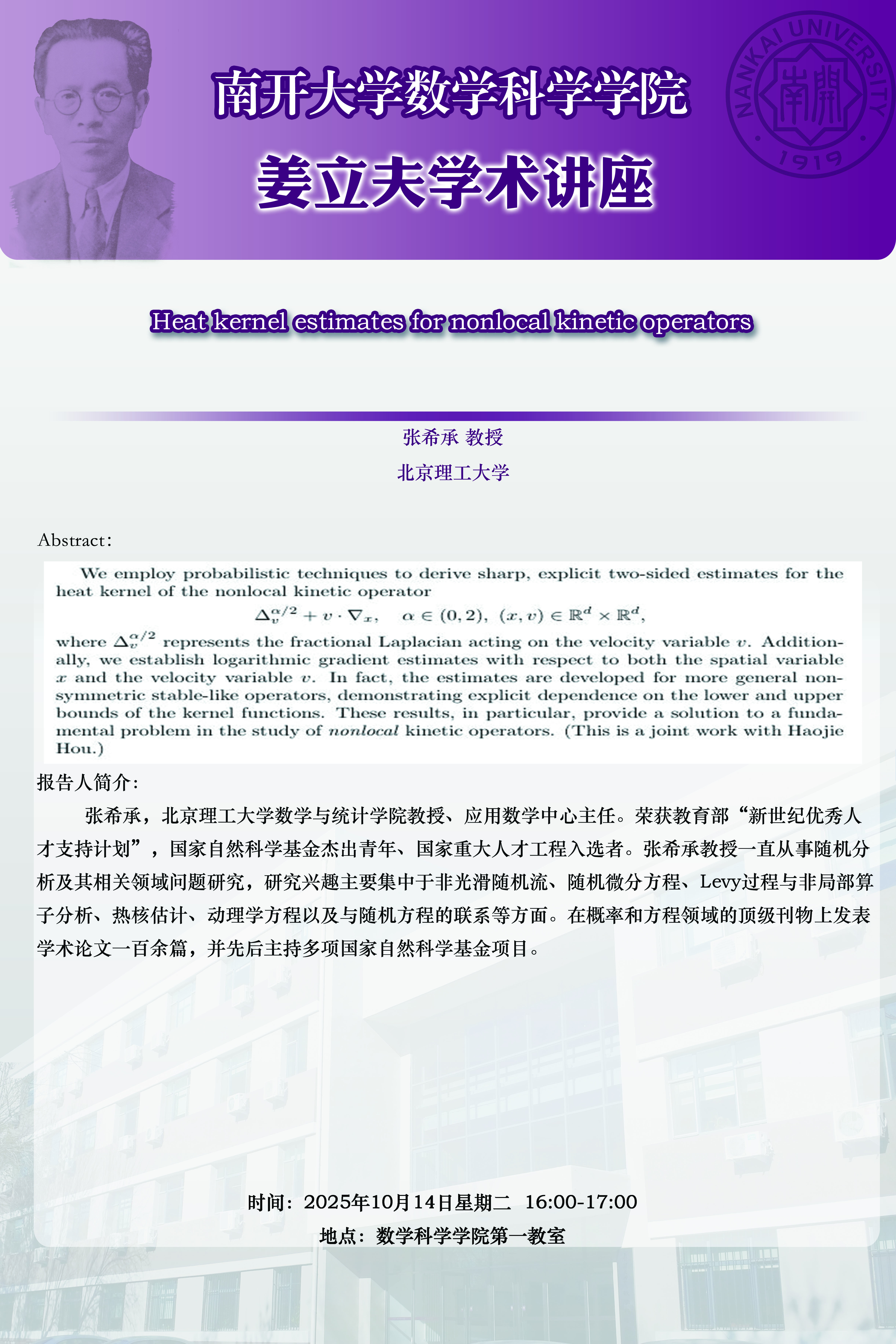 【姜立夫学术讲座】Heat kernel estimates for nonlocal kinetic operators