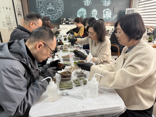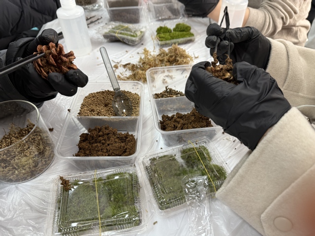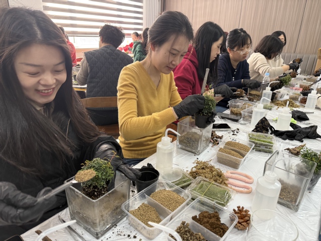 老师们暂时放下繁忙的教学与科研工作,化身“园艺达人”,戴上手套全身心投入到微景观创作中。大家神情专注、动作细致,小心翼翼地为姬月季盆栽填土、扶正花苗,梳理枝叶;用小巧的镊子,将翠绿的苔藓一点点铺在松塔上,精心摆放、耐心点缀,每一个动作都饱含着对生活的热爱与对美的追求。现场欢声笑语不断,老师们相互交流创作心得,在动手实践中放松身心,感受创作的乐趣。