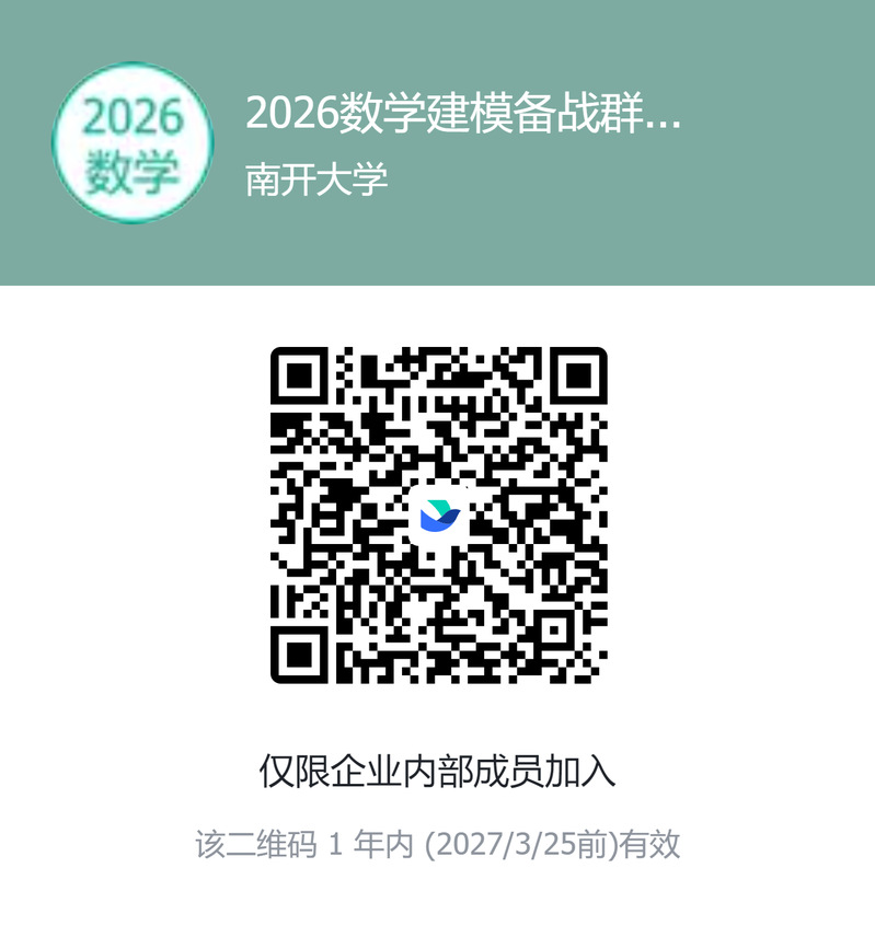 为备战2026年全国老员工数学建赛竞赛及威廉希尓指数500数学建模竞赛(兼选拔赛),现开始竞赛报名工作,组建2026年威廉希尓指数500建模飞书交流群,同学们可以进入飞书交流群进行组队、沟通等工作。