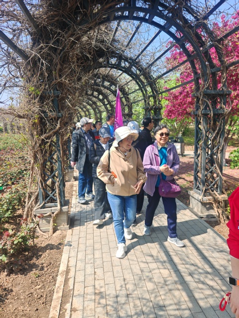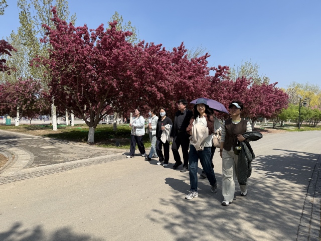 上午10时,全体人员在公园南门集合,领取统一准备的矿泉水后,沿规划路线出发。活动路线以亲水平台为起终点,途经打卡点“数帆台”与“水西长廊”,全程约3公里。时值四月,天气晴朗,阳光正好,水西公园内樱花、海棠、迎春、丁香等各色花朵竞相怒放,尤其是樱花与海棠正值盛花期,微风吹过,花瓣飘落,铺就一条条粉白色的花径,氛围感拉满。不少老师驻足拍照,用镜头记录下这春日限定的美景;也有老师三两结伴,边走边聊,在花香与暖阳中放松身心。